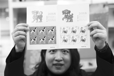 中国邮政发行《戊戌年》特种邮票1套2枚,小本票1本。图案内容分别为“犬守平安”和“家和业兴”。该套邮票延续了第四轮生肖票“合家欢”的设计理念,展示了中华田园犬的形象。图为1月5日,在浙江省宁波市一邮政网点,工作人员展示《戊戌年》生肖邮票小版张。 新华社发