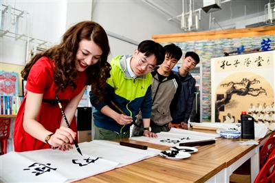 上海合作组织成员国元首理事会第十八次会议即将召开之际,中国石油大学(华东)大学生活动中心,哈萨克斯坦留学生珍珠(左一)在翰墨飘香书画社校友的指导下用毛笔在宣纸上书写。