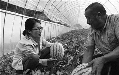 6月25日,延安市宝塔区甘谷驿镇何村党支部书记马苗(右)走访贫困村民,了解健康情况。2012年6月从西安科技大学毕业的马苗,今年4月被选为村党支部书记。同样是延安市安塞区真武洞街道办汤河村党支部书记的白晋英(左),在西瓜大棚里指导村民进行西瓜均匀受光。白晋英2017年7月从陕西科技大学毕业回到自己的家乡,今年3月被选为村党支部书记。陕西省延安市1784个村党组织换届选举工作最近全部完成,共有152名回乡大学生被选为村党支部书记。
