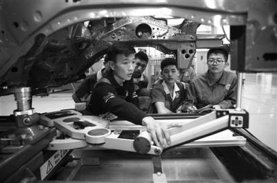8月31日,在山东省日照市技师学院,2017年中国国际技能大赛车身修理项目冠军邓欣(前)向学生们传授车身诊断技术。当日,“技能中国行2018——走进山东”技能展示交流活动在山东省日照市举行,通过举办综合展示、技术交流、专家论坛等活动,全面展示新时期技能教育、技能人才培养成果。 新华社 朱元理 摄