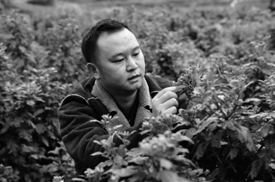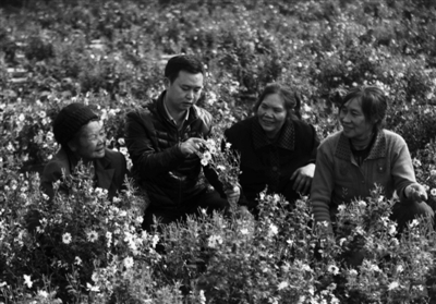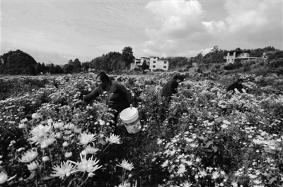 9月22日,简义相查看金丝皇菊的长势。今年34岁的简义相是重庆市黔江区邻鄂镇松林村村民。2014年,为拓宽增收渠道,简义相建起300多亩菊花基地,并带动50多户村民以土地入股的方式种植菊花,其中有20户是贫困户。