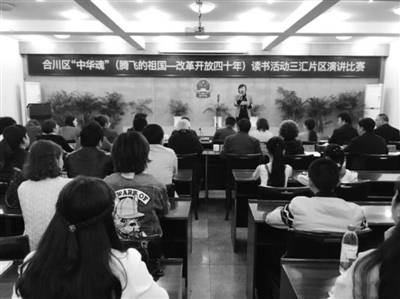 10月9日上午,由四川省重庆市合川区关工委、区委宣传部、区教委、团区委等7部门联合举办的2018年“中华魂”(腾飞的祖国—改革开放四十周年)读书活动三汇片区演讲比赛在三汇镇政府会议室精彩上演。区关工委和各参赛单位的有关领导及来宾100余人观看了比赛。中国矿业大学第20届研究生支教团成员以饱满的热情、向上的精神风貌精心策划和筹备了此次比赛。 雅婷 供稿