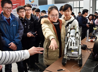 11月25日,在大赛创新成果展上,观众参观体验由中国石油大学创新团队带来的行走式仿生机械臂。