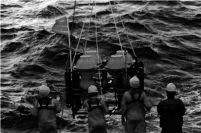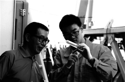 “彩虹鱼”科考团队海上总指挥崔维成(左)和考察队员耿道(右)在观察捕获的深渊生物(12月12日摄)。 世界最深的海沟——马里亚纳海沟近日迎来中国“彩虹鱼”科考团队。他们乘坐“沈括”号一路远航来到这里,探索海洋最深处的科学奥秘。