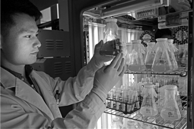 | 西北工业大学生态与环境保护中心合成生物学实验室,研究出可以向细胞外分泌蔗糖的蓝藻,未来以此为核心来打造蓝藻人造叶片系统。图为蒿飞博士在观察蓝藻。视觉中国供图(资料图片) |
