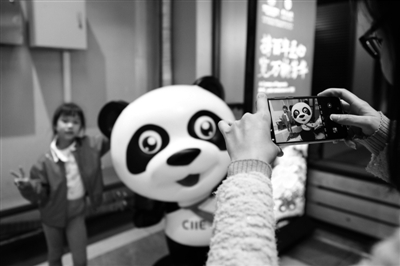 11月10日,在上海国家会展中心举行的第二届中国国际进口博览会闭幕。图为在上海国家会展中心,一名小女孩和“进宝”合影。新华社记者 张玉薇 摄