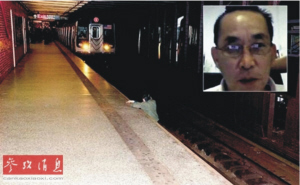 | 12月3日,纽约地铁事故现场摄影师阿巴西所拍的“地铁撞人”照片,小图为当事人韩基石。 |