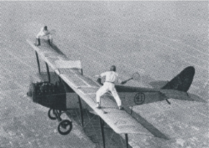前一战飞行员奥莫尔·洛克利尔的绝招是用一只手臂挂住飞机,他经常通过这一方式修理飞行中的飞机。1920年,他在一场电影拍摄中驾驶飞机,但不幸由于灯光照明导致双眼模糊,最终飞机坠毁身亡。值得一提的是,后来的纳粹德国帝国元帅赫尔曼·戈林在一战结束后也曾进行过一段时间的“玩命特技”表演。