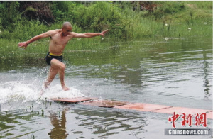 8月12日下午,福建省泉州市区草邦水库湖面上,少林武僧释理亮和几个助手一起打开100多块边长为55厘米的轻薄三合板,连成110米。