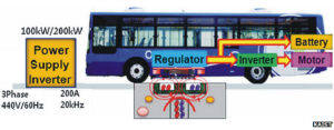 目前,这种无线充电公交车运行的线路是从龟尾市的火车站到In-dong区。在行驶的过程中,公交车底部的设备通过名为“形磁场共振”(Shaped Magnetic Field In Resonance)的技术从地面获取能源。安装在路面下方的电缆可以产生电磁场,公交车设备中的一个线圈会与之作用,产生电能。感应设备距离地面大约为17厘米。