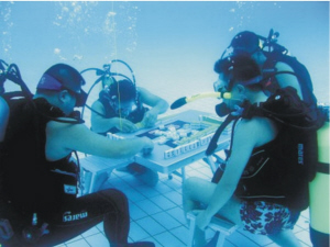 | 潜水爱好者在5.5米深的游泳池底打麻将。 刘炬/摄 |