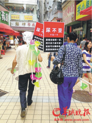 9月1日,是深圳城管部门施行近期备受争议的“公厕尿歪罚款100元”规定的第一天。1日下午1时许,在深圳福田区巴登街公厕门口,一老汉和一村姑身背着数十个塑料制品“尿不歪”, 该“产品”的“发明人”称,这款“尿不歪”有至少五大功能,不仅能让如厕者避免被罚款,还能保护他们的个人隐私,防止被人偷窥。而且声称是在配合城管执法,每个10元。事实上,“尿不歪”就是一个漏斗配上一根细管子。