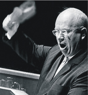 赫鲁晓夫在从事国际活动时,常常口不择言,鲁莽行事,给世界落下许多笑柄。其中最有名的是,赫鲁晓夫出席1960年联合国大会,有一天他在辩论中情绪失控,从脚上脱下皮鞋猛敲桌子,并同西班牙代表吵得几乎动起手来……