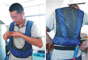 | 8月13日,王彦展示他发明的空调背心外观。 |