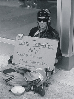 | 在国外,人们乞讨并不仅仅是为了解决温饱。(字牌翻译:时光穿梭者求助,需要钱买新的通量电容器。) |