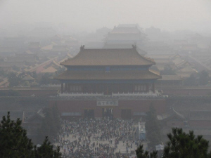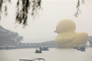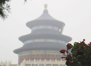 国庆假日期间,北京雾霾严重。景山远眺,望不见故宫全景;天安门上,人民英雄纪念碑只见轮廓;颐和园的“大黄鸭”沉浸在四野白茫茫的孤独之中……气象专家指出,秋冬交季的静稳天气和污染物排放总量过大是主要原因。《科技日报》 2013.10.8