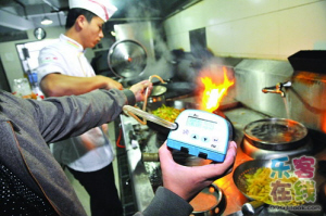 实验结果:把葱姜蒜辣椒放到加热的锅中,空气中出现香味,监测仪的数值跟着迅速变化,最终显示为787微克/立方米,比开始时的38微克/立方米,高出近20倍。谢新源称,如果参照空气质量指数,这已经是“爆表”的级别了。