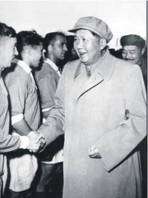 新中国成立后,日理万机的毛泽东依然很关注中国足球。1955年的一个秋日,在先农坛体育场要进行中华体总体训班(实际上的国家队)与苏联泽尼特足球队的比赛。比赛开始前,场内突然发出雷鸣般的掌声。原来,毛泽东来看比赛了。比赛结束后,毛泽东穿着灰色的风衣,身躯魁梧,稳步走向双方的队员。在与客队泽尼特球员握手后,毛泽东向中国队走来,中国国家队教练李凤楼和队长史万春首先迎了上去,毛泽东紧紧地握住他们的手,并用浓重的湖南口音连说几句:“打得好!打得好!”随即又和中国足球队的队员们一一握手。