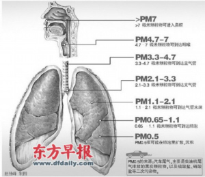 “PM7可以进入鼻腔,PM4.7~7可以到达咽喉,PM2.5可以到达支气管,而PM1可以到达肺泡,PM0.5很可能在肺泡里扩散、沉积。”杨新教授补充道。汽车尾气,主要是柴油机尾气排放的黑炭颗粒物,以及硫酸盐、硝酸盐等二次污染物都是PM0.5的来源。
