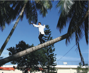 近日,在海南大学校园内一名站在椰子树上练功的“神人”在网上走红。记者现场目睹这位“神人”的了得功夫。其进行简短热身后,快速“飞奔”上椰子树,进行单脚独立或展臂双飞动作练武功,足有20多分钟,其神情泰然自若吸引不少围观者。据了解,该男子名叫符春福,海南儋州人,从小9岁就开始练习功夫,曾在某项武术比赛取得优异的成绩,目前已收了40多名徒弟。对于许多喜爱功夫的爱好者如何掌握好功夫,符春福寄语六个字:“坚持、忍耐、克止”。环球网2013.10.30