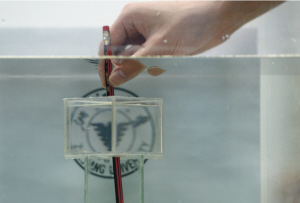 10月31日,浙江大学陈红胜教授研究团队工作人员演示一件“隐身”装置的效果。当一支铅笔被放入该装置中时,铅笔的中间部位“不见了”,但该部位的背景图案仍然可见。