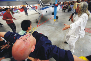 长春奇人董长生在长春国际会展中心表演用眼皮拉动飞机的绝技。董长生用来表演的飞机是一架水陆两用轻型飞机,总重量为560公斤。整个表演过程中,董长生用钩子钩住双眼下眼皮,拉着飞机移动了5米左右。