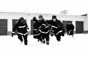 图为这个公司消防员正在清理营区积雪。 (蒋邵华 杜鹏)
