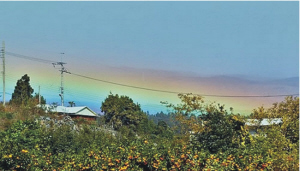 该彩虹不同于普通弧形的彩虹,光线受小水滴折射影响,形成了与地平面平行的模样。