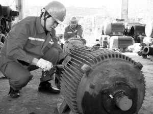 今年9月,在一次跟班劳动中,姬国庆书记发现电修班的员工在往电机里抬装转子时很费力。抬装转子是组装电机关键的步骤,它是一个力气加技巧的活,转子的重量需要5个人共同协作才能完成。电机的腹腔内,转子与定子的气隙只有1毫米左右,在装配时稍不留意就会刮擦到定子线圈,造成绝缘的损伤,从而影响电机的质量。