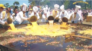 据俄新社12月2日消息,阿根廷庇谷埃市居民用1.5万颗鸡蛋煎制巨型蛋饼,庆祝第129个城市日。参与蛋饼煎制活动的市民约有2万人。据烹饪主厨称,煎制蛋饼的食材除1.5万颗鸡蛋外,还有100公斤火腿、8公斤香菜、8公斤葱、50升油、8公斤盐和6公斤胡椒。本次共有10支队伍负责蛋饼的煎制,每队4人。分别负责在20分钟内将油加热、打开鸡蛋、检查鸡蛋新鲜度等工作。厨师们首先将切好的火腿倒入一个直径为4.5米的平底锅,将火腿稍微翻搅后便将鸡蛋搅匀倒入平底锅进行炒制。