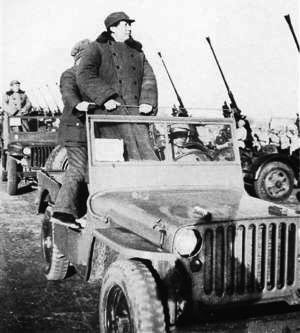 1949年3月,中共中央由河北省平山县西柏坡向北平迁移时,毛泽东坐的是从国民党军队手中缴获的美式军用吉普车,并乘坐它在西苑机场检阅了中国人民解放军受阅部队。这种吉普车用今天的眼光看,会觉得非常简陋:连车门都没有,只是在该装门的地方开了一个缺口;雨刷器是手动的,有一个手摇的曲柄,边开车边用一只手摇动曲柄刮水;车身也很短,后排的空间比较局促,乘坐舒适性很差。可是,这种简陋的汽车当时对于中国共产党人来说,已是奢侈品了。