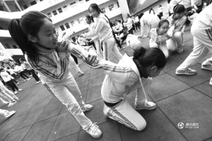 2013年12月12日,湖北襄阳市人民路小学教育集团的六年级女生学习“女子防身术”。为了加强安全教育,防止女童遭遇性侵害,襄阳市人民路小学教育集团特邀忆思特教育中心国家一级跆拳道裁判员张敏,为六年级200多名女生开展了为期一周的“女子防身术”公益培训,以备不时之需。腾讯网2013.12.14王虎/摄