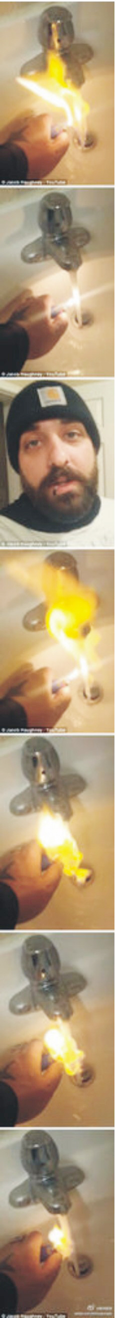 美国男子发现自家自来水可燃烧。美国北达科他州男子雅各布发现自家水龙头中流出的水可以燃烧!而他数年来一直在用这水刷牙和洗澡。专家解释,这种现象是由水力压裂现象导致的。水力压裂是用大量掺入化学物质的水灌入页岩层进行液压碎裂以释放天然气。北达科他州目前是美国产油的第二大州。