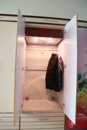 郭中发明的多功能储物柜恰恰可完成补充性杀菌和日常物品保养维护的作用。其技术特点如下:在传统的储物柜内壁上设置烘干灯、风机、消毒灭菌灯、照明灯和香料剂及其它措施,根据需要随时对储物柜内物品分别或同时进行干燥、消毒杀菌、灯光照明、加香等处理,方便实用,安全卫生,适合储存衣服、器材等各种物品。该发明也可针对现有的衣柜、鞋柜、书柜、钱柜、橱柜等储物柜进行改造,完善使用功能,实现自主照明和杀菌功效。