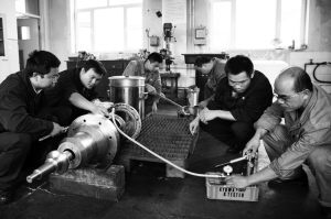 图为这个厂员工正在对关键机组配件进行维护检查。 (张太亭)