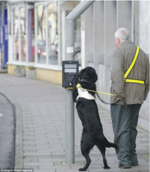 据悉,这条拉布拉多导盲犬名叫米勒(Miller),它的主人是现年68岁的克里斯·迈克尔。当时迈克尔正牵着米勒过马路,米勒为了帮主人按下交通灯等待按钮,不得不直立起身体,扒到柱子上。