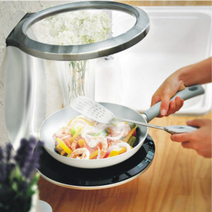 实际上,S.I.A.M就是一个环形小烟机和电磁炉的组合,它非常适合单身贵族的快速烹饪。当无需使用时,可把电磁炉往上折至墙内,放下和折入电磁炉会自动打开或关闭其电源,非常方便。另外,待电磁炉折入墙内后,环形烟机亦可再往下折。只需要2秒钟,S.I.A.M就可以变成了一个嵌入墙体的装饰品了,完全不占任何厨房空间。