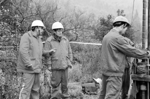 | 付洪(左一)与傅波(左二)一起检查钻井安全 |