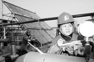 图为这个厂女正在录取原油集输的压力和温度。 (胡 强)