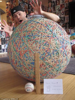 美国纽约一名35岁的男子从3岁开始就用橡皮筋做彩球,现在这个球越来越大,重量已超过250磅(约113公斤)。