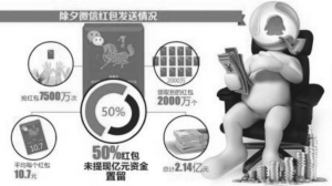新年收到最大“红包”的当属腾讯公司,由于微信“新年红包”必须绑定银行卡,一夜激增的千百万移动支付新客户,可谓一个晚上干了支付宝8年的活,而且还不花腾讯一分钱。