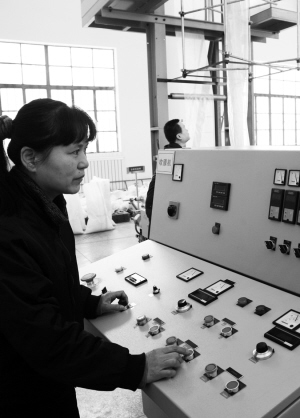 图为这个厂中心化验室员工正在做吹膜试验。(张太亭)