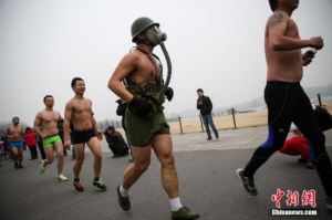 2月23日,跑步爱好者们参加在北京奥林匹克森林公园举行的“光猪跑”活动。近日,北京持续遭遇雾霾天气,空气质量达到严重污染。中新社