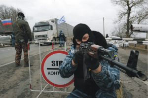 亲俄的乌克兰“金雕”特种部队士兵设立检查站,阻止乌克兰武装力量进入克里米亚境内。