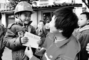 图为这个部青年志愿者正在为留守儿童进行慰问。