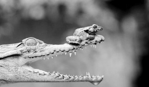 胆大的青蛙惬意地骑在鳄鱼长鼻子上休息。鳄鱼只能用大眼睛贪婪地盯着这只猎物,嘴巴张得老大,但就是吃不着。最终,这只幸运的青蛙及时跳走,离开了这个小池塘。