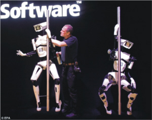据外媒日前报道,信息科技界的年度盛事“德国汉诺威电子展”(CeBIT)3月10日隆重开幕。此次盛会安排了特别的表演嘉宾——一对真人般大小的白色机器人在台上“献艺”,为观众表演劲爆的钢管舞。它们随音乐绕着钢管舞动,动作十分撩人,成为全场焦点。