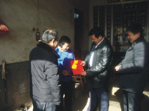 | 山东省滕州市滨湖镇总工会以关注弱势群体为中心,积极搭建救助平台,为困难职工扶危济困。图为工会领导为西古村农民送去为儿子治病的救助金。 |