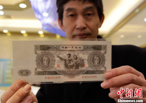3月15日,河南钱币经三路店,61岁男子展示半个多世纪的同龄10元人民币,当日报价30万元。据了解,这张面值10元的人民币,是1953年的中国第二套人民币,俗称“大黑十”,市场上很少有全新品相,价格一路看涨。