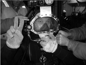 | 戴上潜水头盔后说话不便,只能用手势和眼神交流 |
